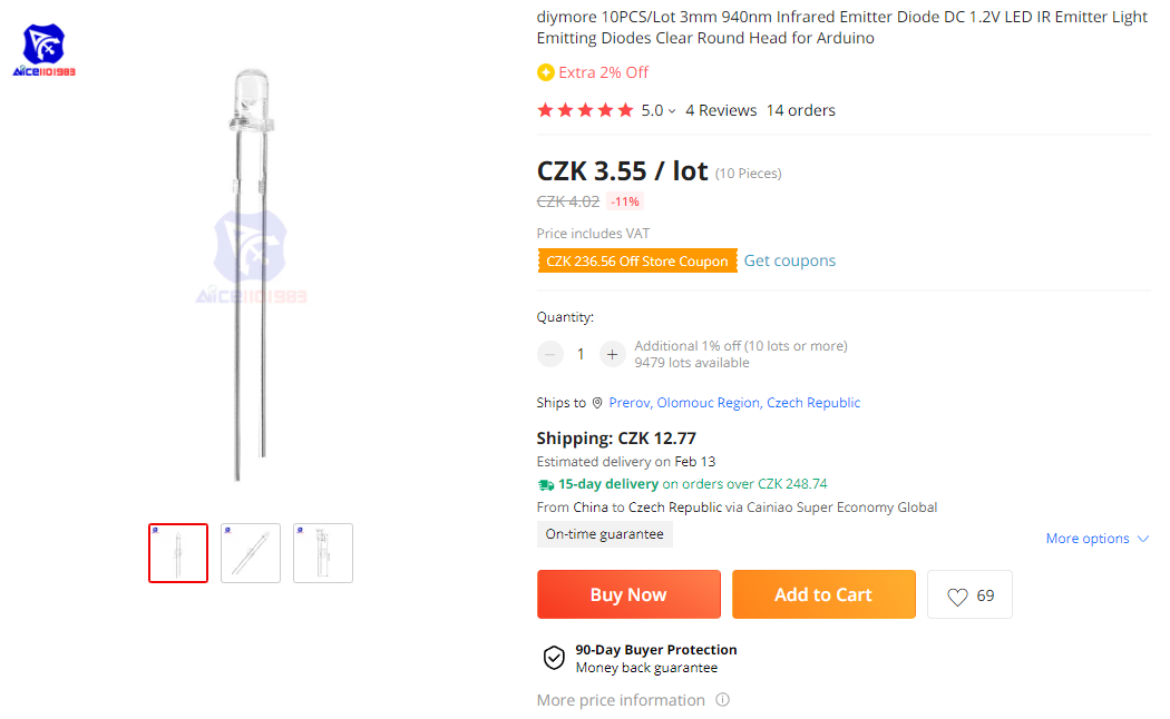 LEDku s rezistorem 330Ohmů. Toto lze vytáhnout z jakéhokoliv pokaženého spotřebiče.