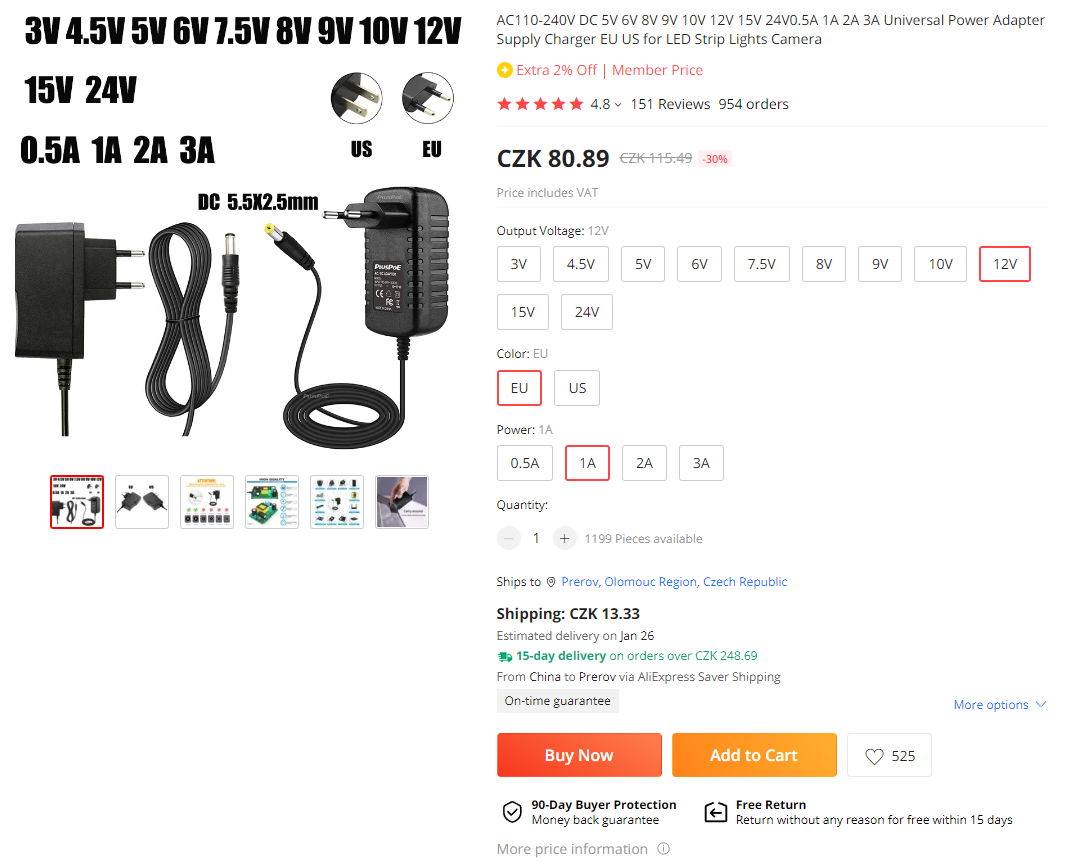 Nakonec je potřeba vyštrachat nějaký zdroj, nebo baterku od 8V do 35V pro motůrky z CD-romek. Nebudou žrát skoro nic, bude vyhovovat skoro cokoli. Dejte si jen pozor, abyste nepoužili zdroj proudu místo zdroje napětí !!!